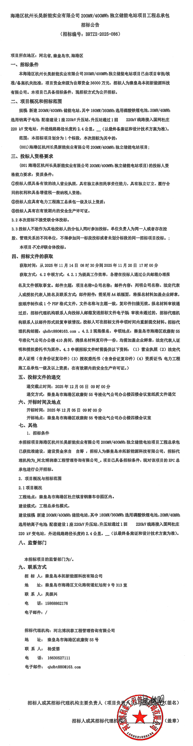 北极星储能网讯:2025年11月13日,秦皇岛本拓新能源科技有限公司发布杭州长昊新能实业有限公司200MW/400MWh独立储能电站项目招标公告,其中180MW/360MWh选用磷酸铁锂电池,20MW/40MWh选用钠离子电池,配套建设1座220kV升压站,升压站通过1回220kV线路接入国网杜庄220kV变电站。项目总投资36000万元,合单价0.9元/Wh,资金来源为自筹资金。