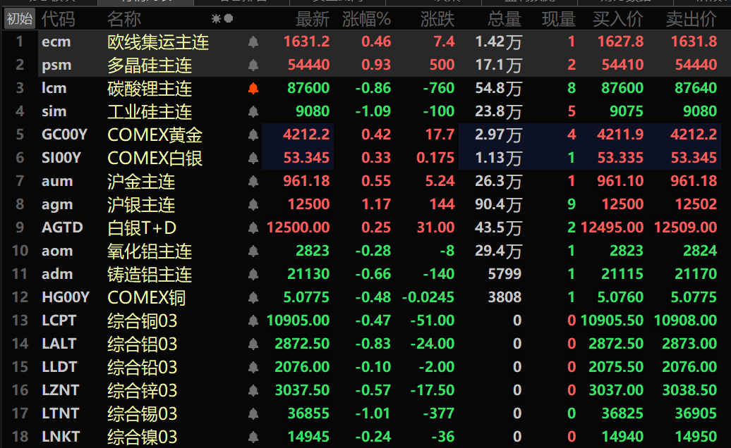 此外,铸造铝主连期货跌0.66%,氧化铝主连跌0.28%。碳酸锂主连跌0.86%,工业硅主连跌1.09%。多晶硅主连涨0.93%。