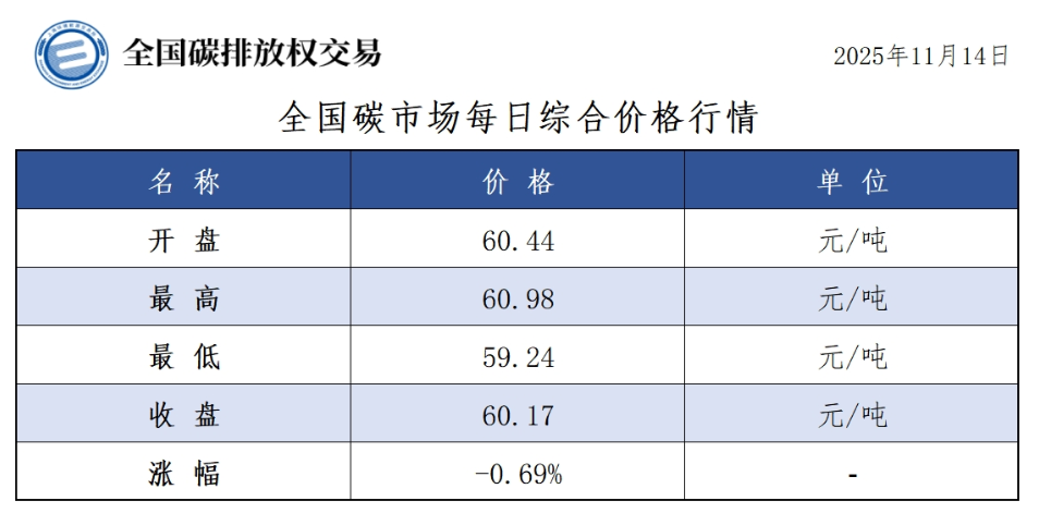 2025年1月1日至11月14日,全国碳市场碳排放配额成交量165,671,978吨,成交额10,256,444,337.50元。