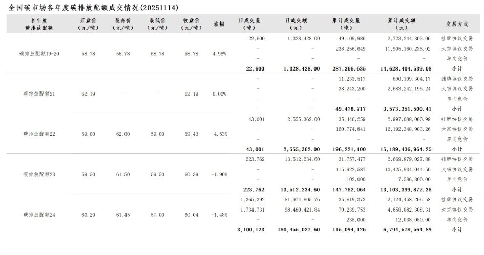截至2025年11月14日,全国碳市场碳排放配额累计成交量795,940,642吨,累计成交额53,289,171,441.01元。