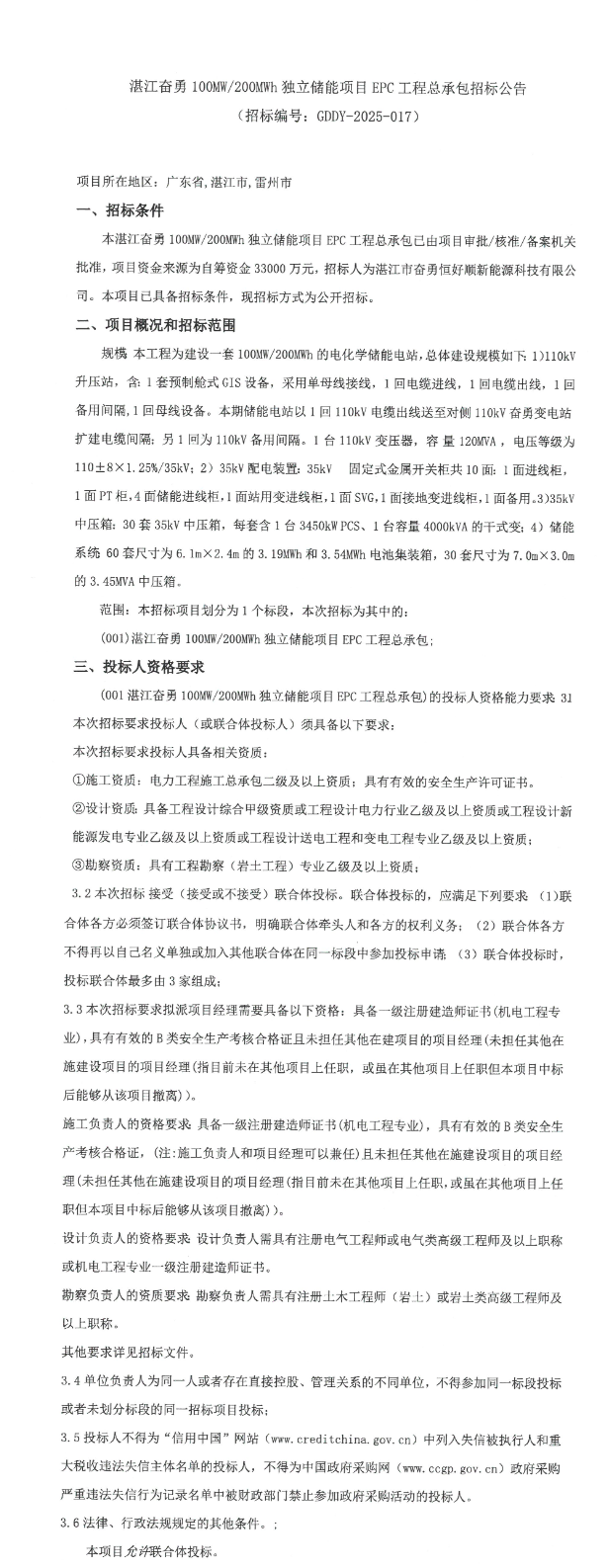 11月14日,湛江市奋勇恒好顺新能源科技有限公司发布湛江奋勇100MW/200MWh独立储能项目EPC工程总承包招标公告。项目位于广东省湛江市雷州市,建设一套100MW/200MWh的电化学储能电站。