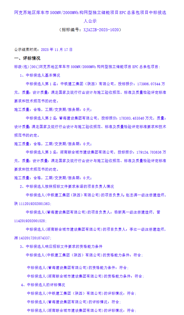 北极星储能网获悉,11月13日,阿克苏地区库车市500MW/2000MWh构网型独立储能项目EPC总承包项目中标候选人公示。