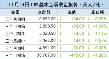 伦敦时间11月14日17:00(北京时间11月15日01:00),LME三个月期铜下跌104美元,或0.95%,收报每吨10,852.0美元。