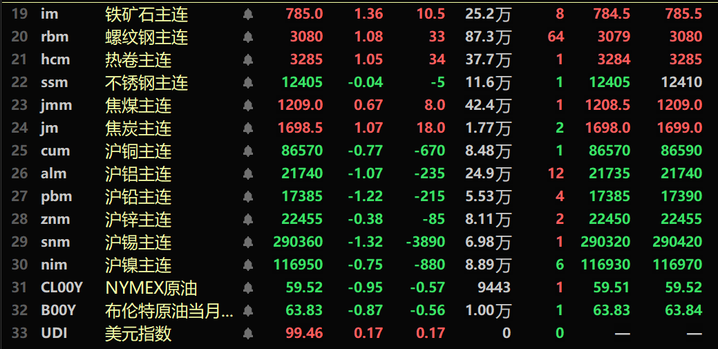黑色系多飘红,铁矿涨1.36%,螺纹涨1.08%,热卷涨1.05%,不锈钢微跌。双焦方面:焦煤主力合约涨0.67%,焦炭主力合约涨1.07%。
