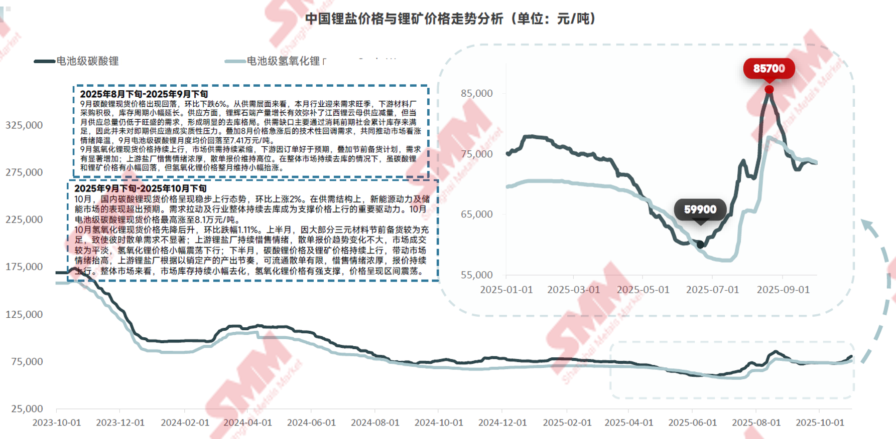 根据SMM了解,尽管8月和9月期间,江西锂云母和青海盐湖的碳酸锂产量供应缩减,但得益于锂辉石供应量的增加,碳酸锂的整体产量仍然保持了持续增长的趋势。