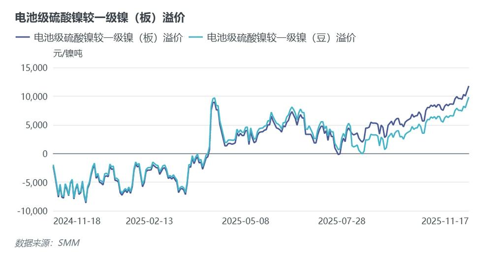 需求方面,今年三元市场旺季延续时间超过预期,在新能源相关补贴退坡刺激下,本月下游订单整体较10月基本持平,带动镍盐采购需求维持高位。