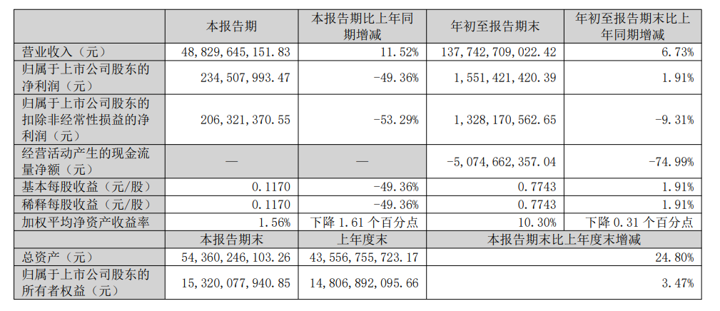 云南铜业发布2025年第三季度报告显示:今年前三季度,公司实现总营收1377.43亿元,同比增长6.73%;归属上市公司股东的净利润15.51亿元,同比增长1.91%。