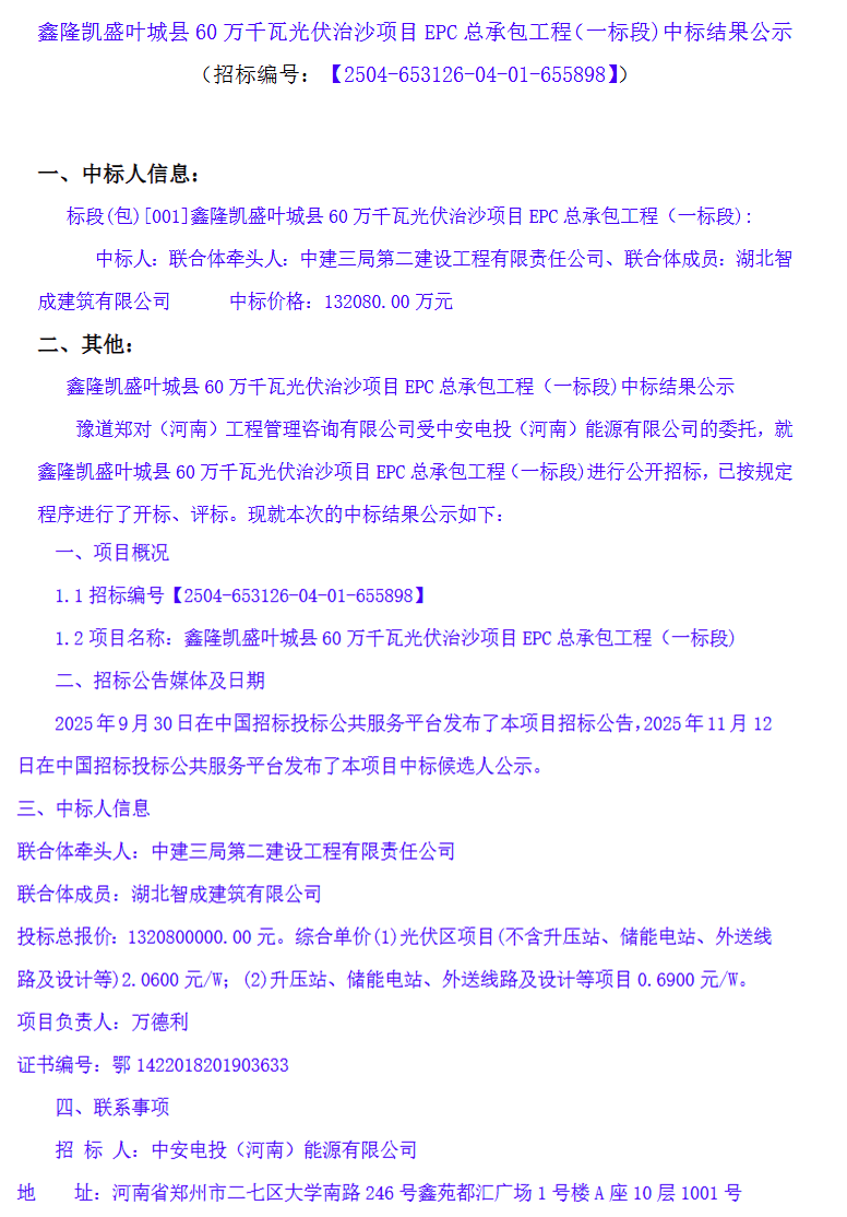 11月17日,鑫隆凯盛叶城县60万千瓦光伏治沙项目EPC总承包工程(一标段)中标结果公示,中标人为联合体:(中建三局第二建设工程有限责任公司、湖北智成建筑有限公司),中标价格为132080万元,单价3.302元/W。