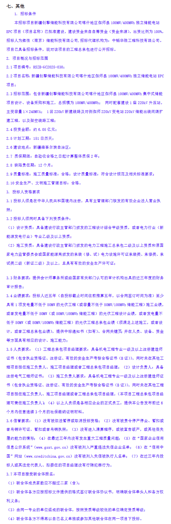 11月14日,柔性(南京)储能科技有限公司发布新疆创擎储能科技有限公司喀什地区伽师县100MW/400MWh独立储能电站EPC项目招标公告。项目招标范围包含新疆创擎储能科技有限公司喀什地区伽师县100MW/400Mwh 集中式储能项目设计、设备采购和施工,总规模为 100MW/400MWh;同时配套建设1 座 220kV升压站,主变容量1X240MVA;1回220kV新建线路及对侧伽师220kv变电站220kV储能出线间隔扩建工程,以及架空线路工程。