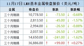 伦敦时间11月17日17:00(北京时间11月18日01:00)LME三个月期铜下跌73.5美元,或0.68%,收报每吨10,778.5美元。
