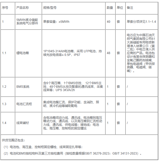 2.1项目概况:本项目为中石油济柴时代(山东)新能源技术有限公司40套5MWh液冷储能系统电气分部件采购招标,本次招标为公开招标。