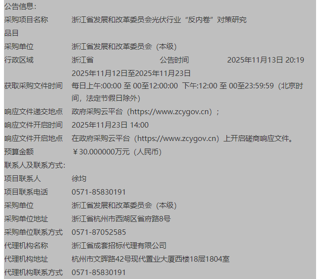 11月13日,浙江省发展和改革委员会光伏行业“反内卷”对策研究的竞争性招标公告发布。