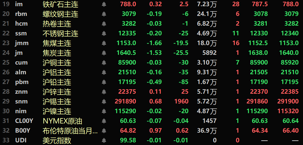 隔夜黑色系多飘绿,铁矿涨0.32%,不锈钢跌0.2%,螺纹钢跌0.19%,热卷微跌。双焦方面:焦煤跌1.66%,焦炭跌1.53%。