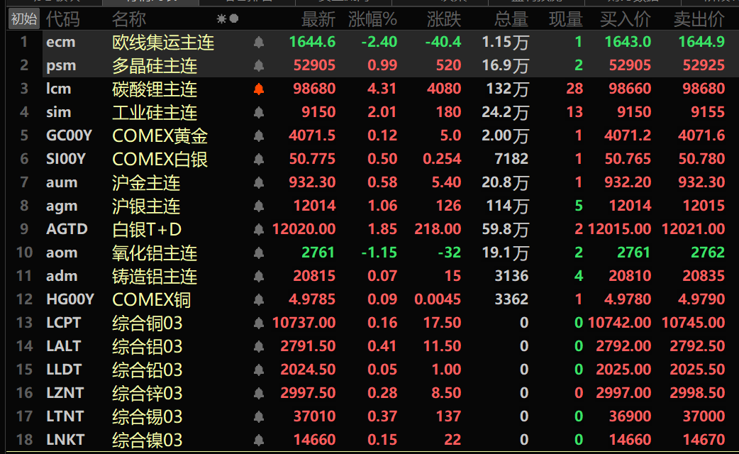此外,铸造铝主连期货涨0.07%,氧化铝主连跌1.15%。碳酸锂主连涨4.31%,盘中刷新自2024年6月以来的新高至100080元/吨。工业硅主连涨2.01%。多晶硅主连涨0.99%。