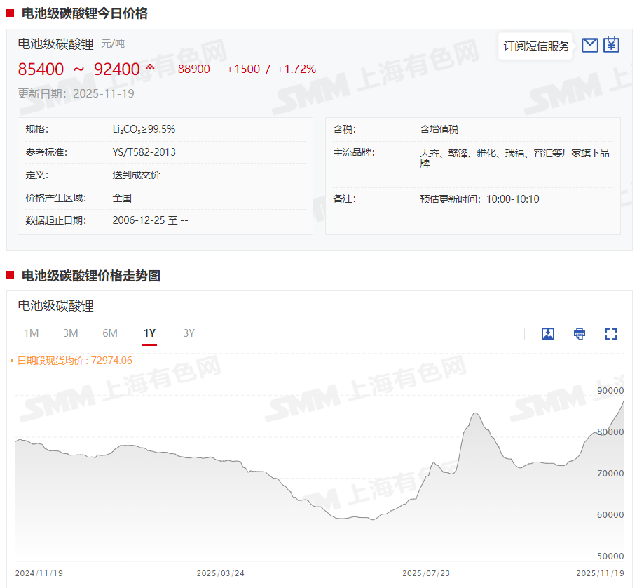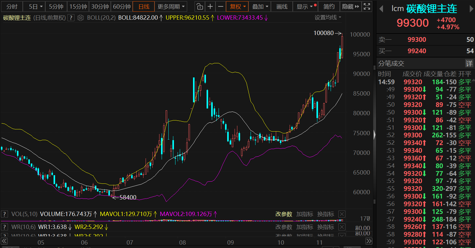 SMM 11月19日讯:近期,锂电板块在下游需求持续向好的背景下,市场情绪高涨,资金的大量涌入带动碳酸锂期货价格在近几个交易日表现十分惹眼,在11月17日以高达9%的涨幅涨停封板之后,今日碳酸锂期货主连盘中一度冲破10万元/吨的整数关口,最高一度涨至100080元/吨,刷新2024年6月以来的新高。截至日间收盘,碳酸锂主连以4.97%的涨幅报99300元/吨。