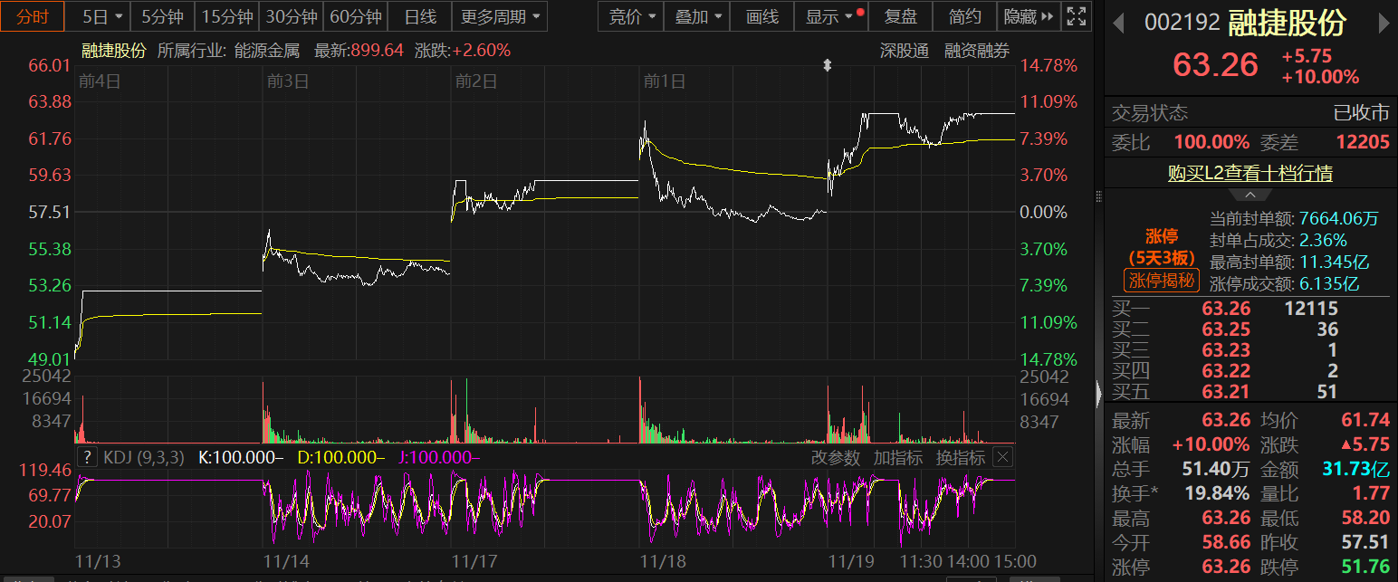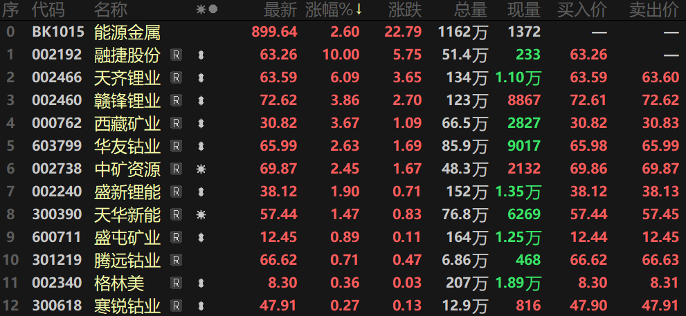 受碳酸锂价格大幅拉涨带动,能源金属板块近几个交易日也接连走高,11月18日盘中最高冲至926.16的高位,刷2022年8月以来的新高。今日能源金属板块盘中再度上涨,指数涨幅最高冲至4.47%左右。个股方面,融捷股份以10%的涨幅封死涨停板,天齐锂业、赣锋锂业、西藏矿业德国多股均涨逾3%。