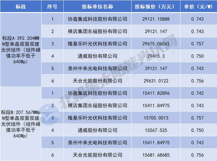 公示结果显示,6家企业入选,分别是协鑫集成科技股份有限公司、横店集团东磁股份有限公司、隆基乐叶光伏科技有限公司、通威股份有限公司、泰州中来光电科技有限公司、天合光能股份有限公司,投标单价区间为0.743-0.757元/W。
