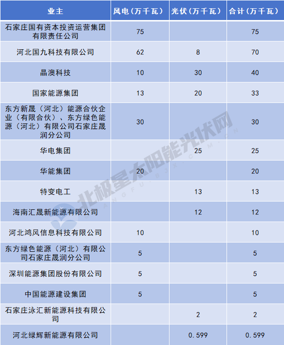 从业主来看,石家庄国有资本投资运营集团有限责任公司、河北国九科技有限公司取消风光项目指标规模分别为750MW、700MW,晶澳科技达400MW;国家能源集团东方新晟(河北)能源合伙企业(有限合伙)及东方绿色能源(河北)有限公司石家庄晟润分公司分别超300MW。