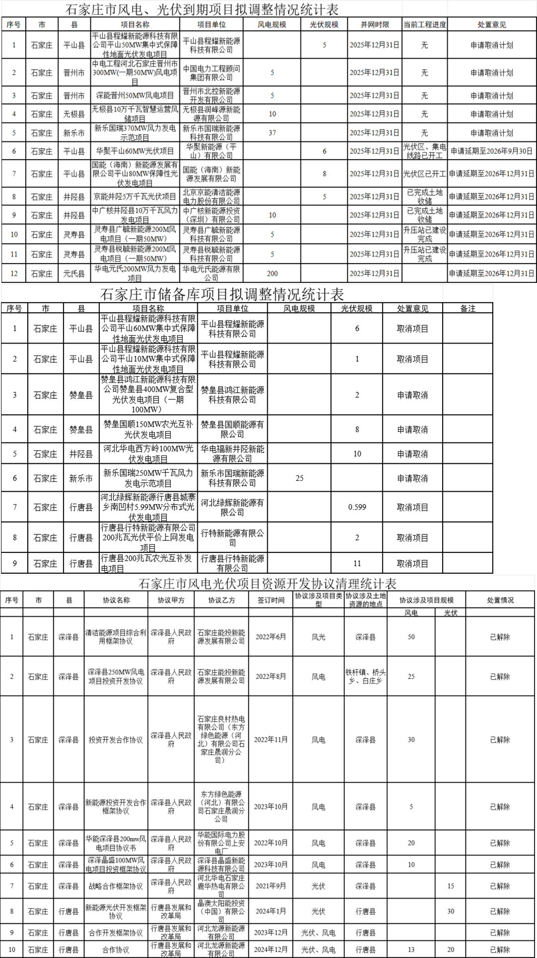 11月18日,石家庄市发改委发布《石家庄市风电、光伏项目拟调整情况公示》,对2025年底到期项目、储备库项目和资源开发协议情况进行了摸底,并结合企业投资积极性、土地资源落实情况、项目前期手续办理及施工进度等研究提出了处置意见。