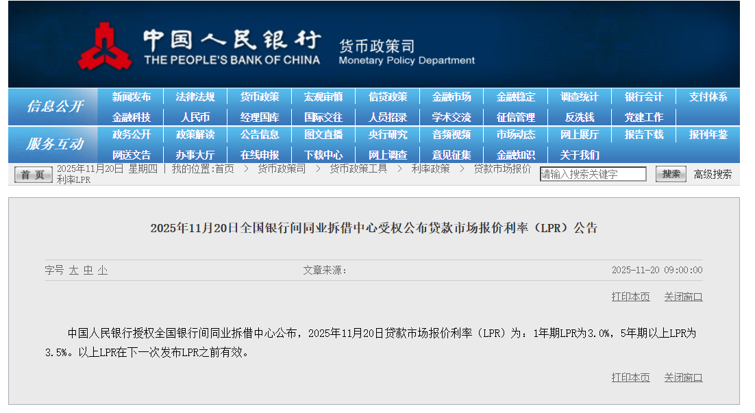 中国人民银行授权全国银行间同业拆借中心公布,2025年11月20日贷款市场报价利率(LPR)为:1年期LPR为3.0%(上月为3%),5年期以上LPR为3.5%(上月为3.5%)。以上LPR在下一次发布LPR之前有效。