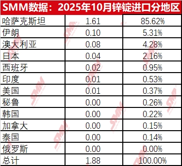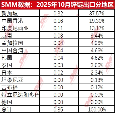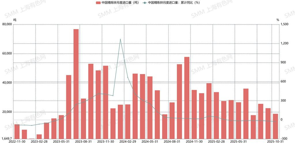 根据最新的海关数据显示,2025年10月精炼锌进口量1.88万吨,环比下降0.38万吨或环比下降16.94%,同比下降67.39%,1-10月精炼锌累计进口27.7万吨,累计同比下降26.63%。10月精炼锌出口0.85万吨,即10月精炼锌净进口1.03万吨。