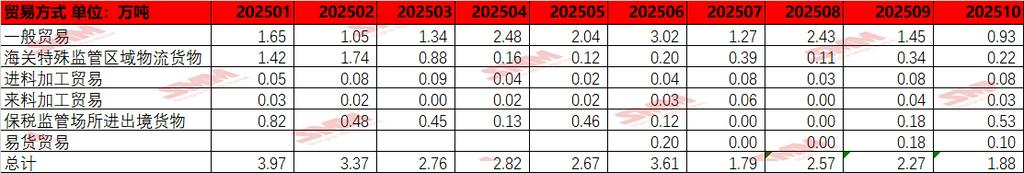 从分国别数据来看,10月精炼锌进口前三的国家是哈萨克斯坦1.61万吨(85.62%),伊朗0.1万吨(5.31%),澳大利亚0.08万吨(4.28%),整体进口量均有下降;10月精炼锌出口增加,出口前三的国家是新加坡0.32万吨(37.57%),中国香港0.16万吨(19.3%),印度尼西亚0.11万吨(13,17%),整体来看出口主要为东南亚地区,另外从贸易方式上来看,海关特殊监管区域物流货物流出明显,随着出口现货窗口开启,精炼锌出口量增加明显。