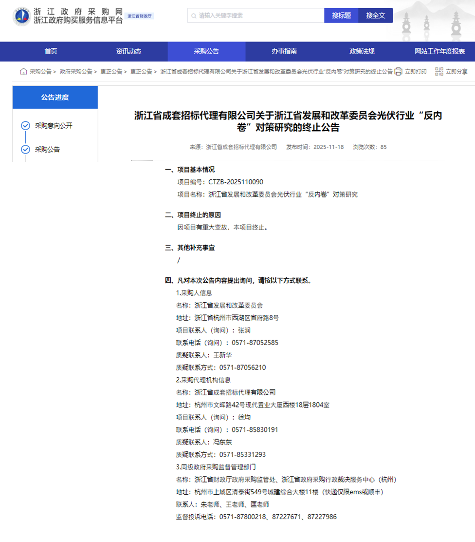 11月18日,浙江省成套招标代理有限公司关于浙江省发展和改革委员会光伏行业“反内卷”对策研究的终止公告。