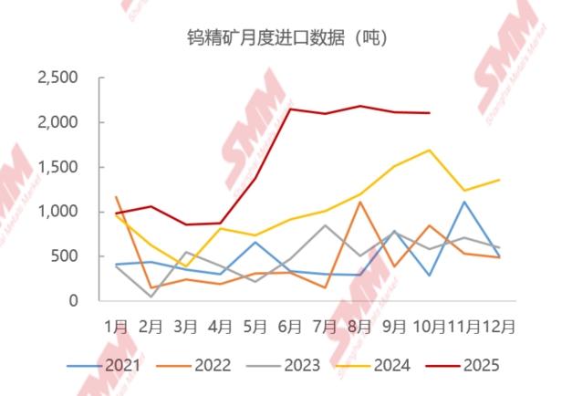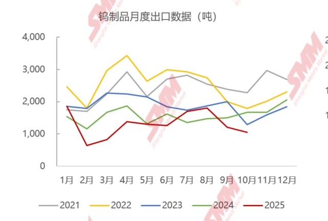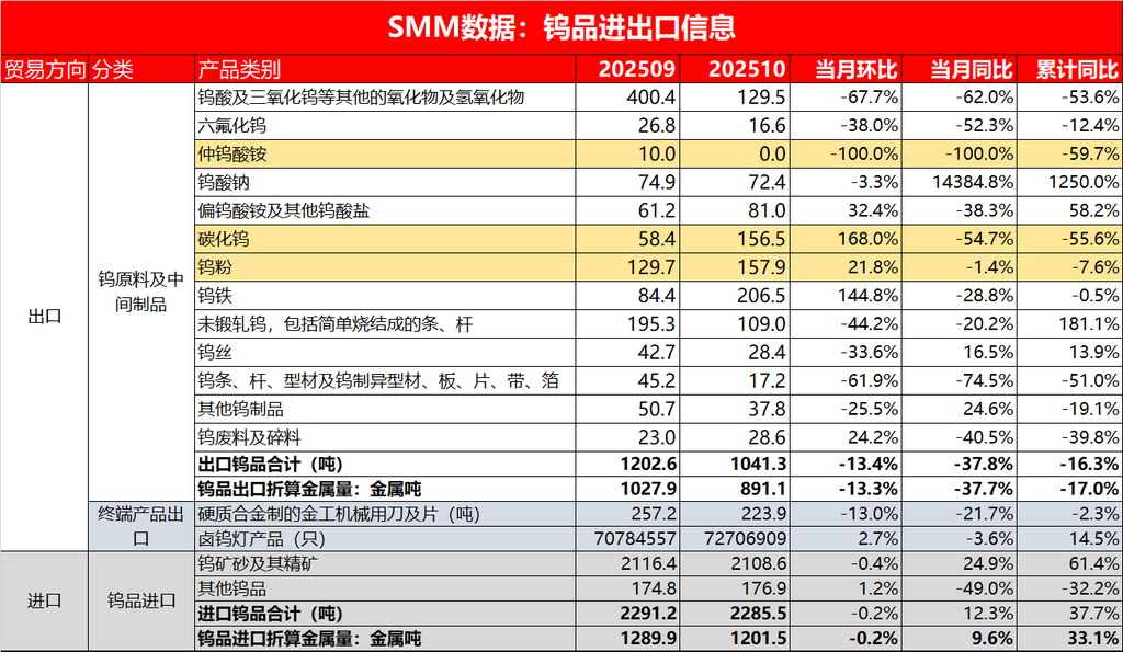 据海关数据显示,2025 年 10月,我国钨品出口合计1041.3 吨,环比减少13.4%,同比减少 37.8%;2025年1 - 10 月国内钨品出口总量约为12997吨,累计同比下降16.3%,折算金属量约合10927金属钨,同比下降 17.0%。2025 年10 月,我国钨品进口合计 2285.5吨,环比下降0.2%,同比增长12.3%;2025年1 - 10 月国内累计进口钨品约18059吨,同比增长 37.7%,进口折算金属量累计同比增长33.1%。从分月的进出口数据来看,2025年国内国内钨品进出口结构调整,以钨精矿等原料为主的进口量增量明显,而钨酸盐等钨制品产品出口则因国内出口管制及海内外价差等原因影响,钨品出口结构变化较大,出口总量下降明显,部分钨品出口断崖式下跌,录得历史新低,8月份以来国内钨价格高位震荡,海外钨品跟涨不及,国内钨相关产品的出口利润下降明显,偏钨酸铵等钨酸盐类出口呈现环比下降状态,而下游硬质合金及卤钨灯产品出口保持稳步增长状态。