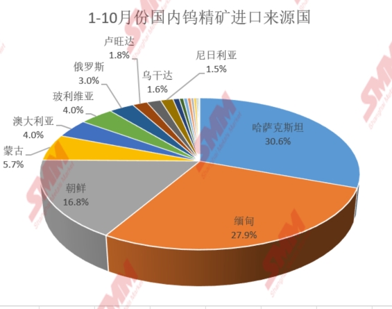 钨精矿进口数据:2025年10月份国内钨矿进口总量约为2108.6吨,环比下降0.4%,同比增长24.9%,2025年1-10月份国内钨精矿进口总量同比增长61.4%至15809吨左右,增量主要来源于哈萨克斯。海关数据显示,2025年1-10月份国内钨精矿进口来源于哈萨克斯坦总量约4839吨,占国内钨精矿总量的30.6%,位居第一。进口来源于缅甸的钨精矿总量约为4406吨,占国内钨精矿总量的27.9%。进口来源于朝鲜的钨精矿总量约2652吨,占国内钨精矿总量的16.8%。从进口注册地来看,进口钨精矿主要发往江西、云南、辽宁、福建等省份及地区。其中1-10月份江西省钨精矿进口总量约为5825吨左右,占国内钨精矿进口总量的36.8%,云南省钨精矿进口总量约为4790吨左右,占进口总量的30.3%。