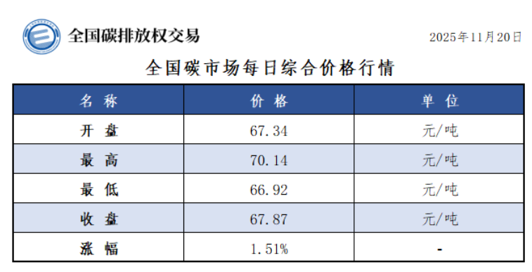 今日全国碳市场综合价格行情为: 开盘价67.34元/吨,最高价70.14元/吨,最低价66.92元/吨,收盘价67.87元/吨,收盘价较前一日上涨1.51%。