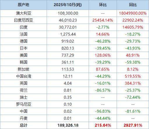 以下为根据中国海关总署官网数据整理的2025年10月氧化铝进口分项数据一览表:
