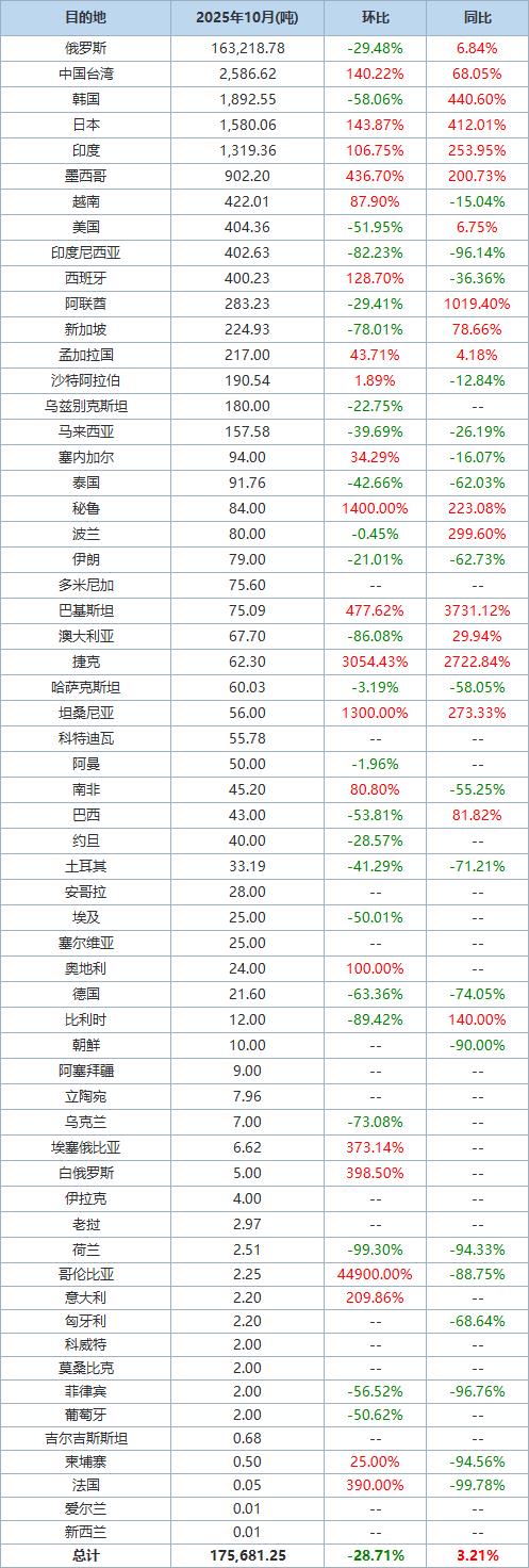 以下为根据中国海关总署官网数据整理的2025年10月氧化铝出口分项数据一览表: