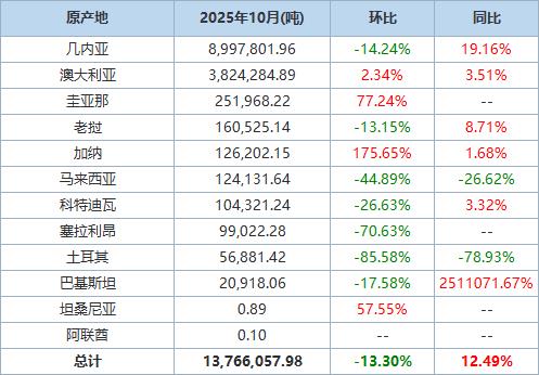 以下为根据中国海关总署官网数据整理的2025年10月铝土矿进口分项数据一览表: