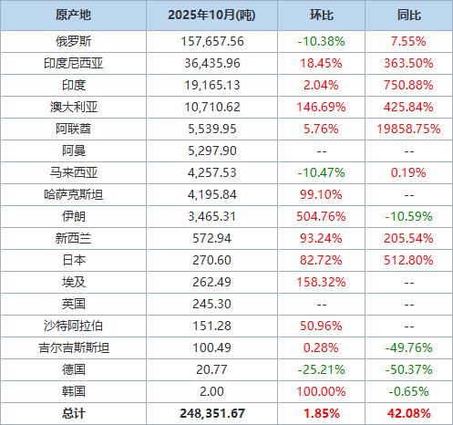 以下为根据海关总署官网数据整理的2025年10月原铝进口分项数据一览表: