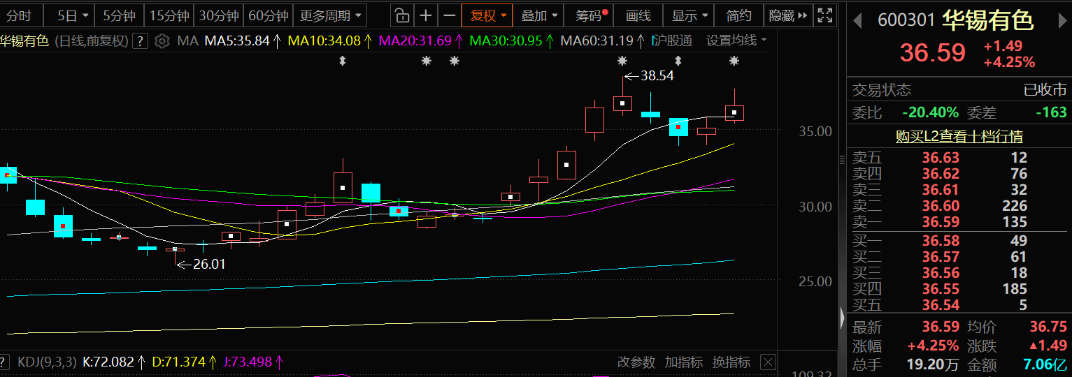 11月20日,华锡有色股价出现明显上涨,截至20日收盘,华锡有色涨4.25%,报36.59元/股。