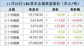 伦敦时间11月20日17:00(北京时间11月21日01:00),LME三个月期铜下跌14美元,或0.13%,收报每吨10,738.5美元。