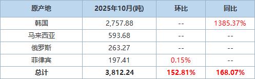 以下为根据中国海关总署官网数据整理的2025年10月精炼铅进口分项数据一览表: