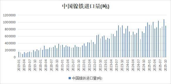 2025年1-10月中国镍铁进口总量925.8万吨,同比增加215.8万吨,增幅30.4%。其中,自印尼进口镍铁量902.5万吨,同比增加218.6万吨,增幅32.0%。