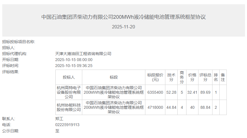11月20日,中国石油集团济柴动力有限公司200MWh液冷储能电池管理系统框架协议中标结果公告,杭州高特电子设备股份有限公司、杭州协能科技股份有限公司中标。