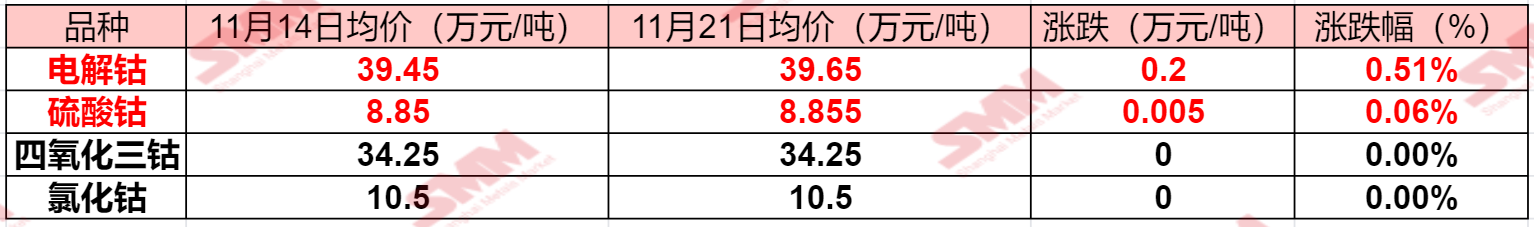 SMM 11月21日讯:本周钴系产品价格波动相较上周有所收窄,但电解钴和硫酸钴报价依旧迎来小幅上涨,其中电解钴下游需求端开始出现遍及改善的迹象,而硫酸钴市场,上下游对价格的分歧仍在……SMM整理了本周钴系产品的价格波动情况,具体如下: