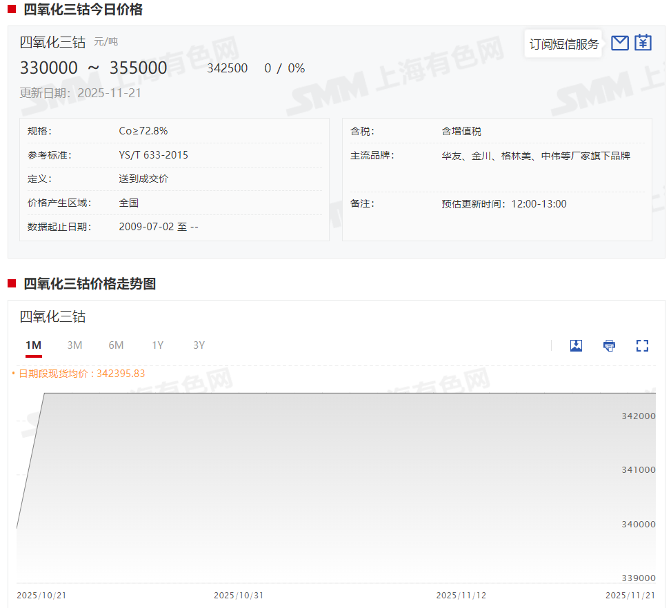 据SMM现货报价显示,本周四氧化三钴现货报价同样维持稳定,截至11月21日,四氧化三钴现货报价维持在33~35.5万元/吨,均价报34.25万元/吨,较11月14日持稳运行。