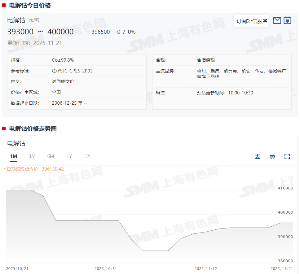 据SMM现货报价显示,本周电解钴现货报价呈现上涨态势,但仅在11月20日上涨2000元/吨之后便暂时持稳,截至11月21日,电解钴现货报价涨至39.3~40万元/吨,均价报39.65万元/吨,较11月14日涨幅达0.51%。