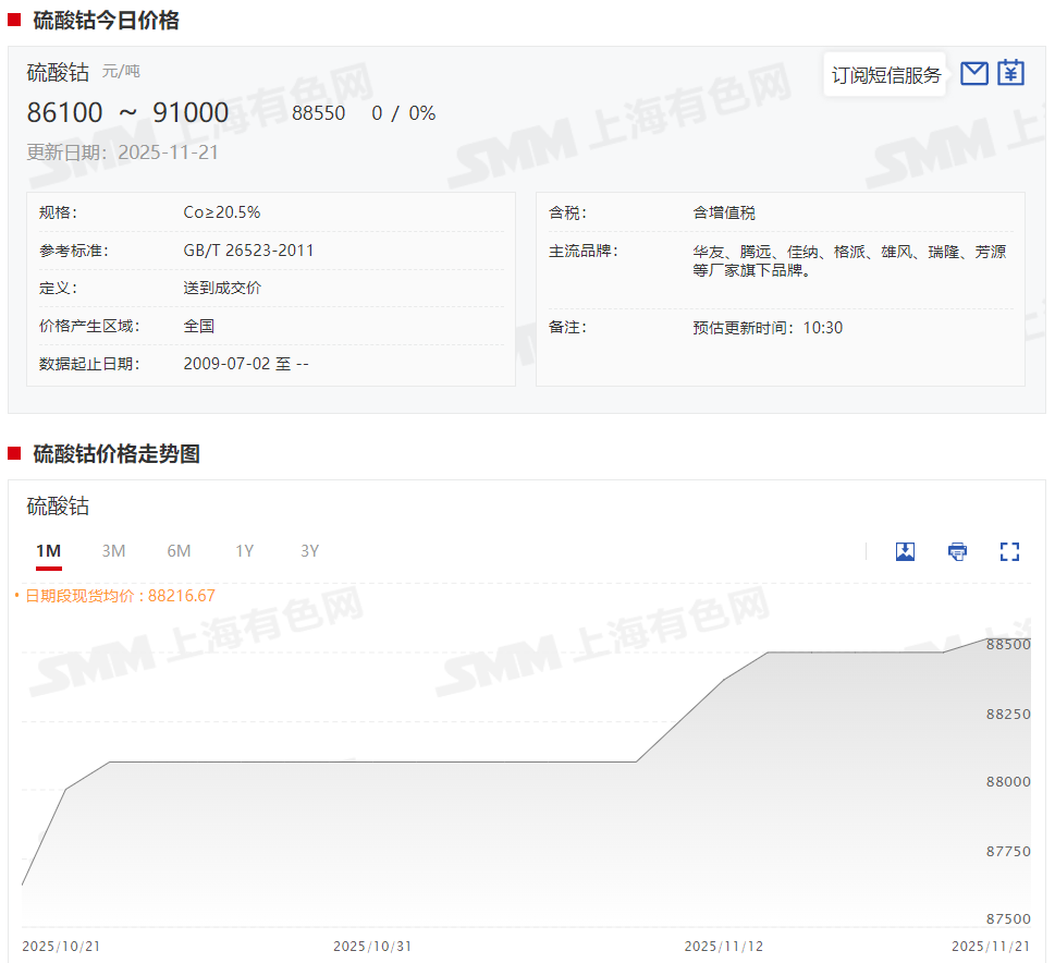 据SMM现货报价显示,本周硫酸钴现货报价也有小幅上涨,截至11月21日,硫酸钴现货报价涨至8.61~9.1万元/吨,均价报8.855万元/吨,较11月14日上涨50元/吨,涨幅达0.06%。