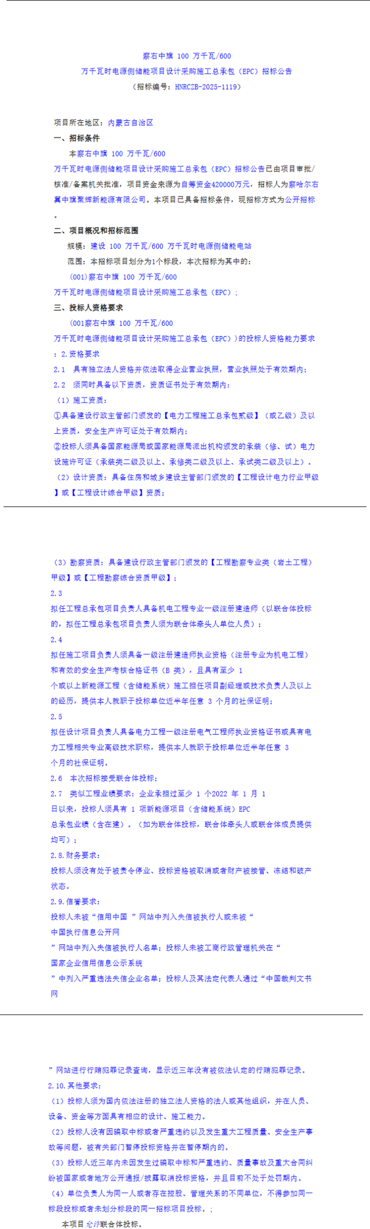 11月21日,察右中旗100万千瓦/600万千瓦时电源侧储能项目设计采购施工总承包(EPC)招标公告发布。该项目位于内蒙古自治区,由察哈尔右翼中旗聚辉新能源有限公司负责招标,项目资金为自筹资金420000万元,合0.7元/Wh。