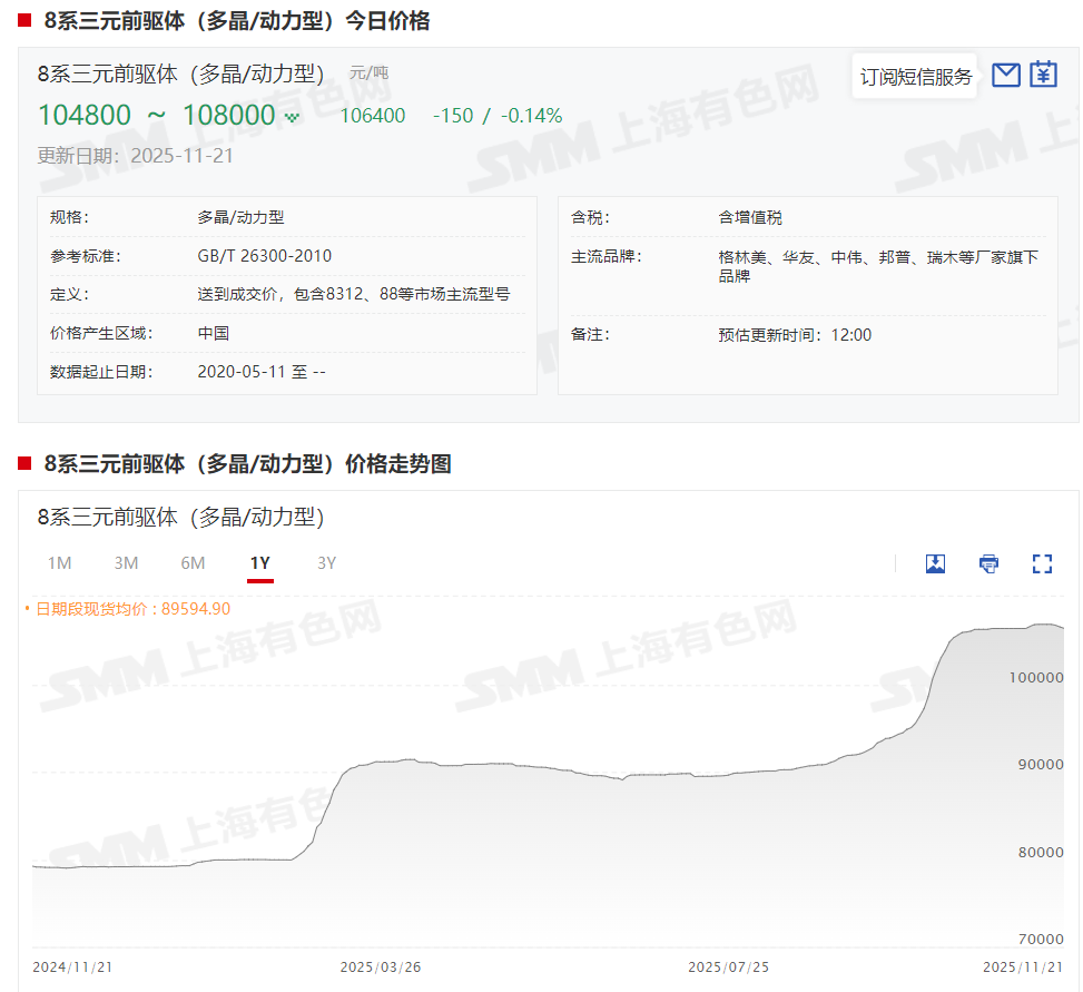 三元前驱体价格方面,以8系三元前驱体(多晶/动力型)为例,其现货报价从年初的79165元/吨,涨至11月21日的106400元/吨,涨幅达34.4%。从近期的市场情况来看,虽然当前动力市场需求维持旺盛,头部厂商预计将维持较高开工率至年底;小动力及消费类市场在传统旺季和原材料看涨预期的共同推动下表现积极,下游仍存在一定备货需求。尽管订单整体表现良好,但前驱体厂商仍面临较大的成本压力。目前部分厂商已就明年长单的商务条件展开初步协商,但最终结果预计仍需一段时间方能明朗。当前散单折扣在不同厂商间差异较大,整体水平较上周变动有限。