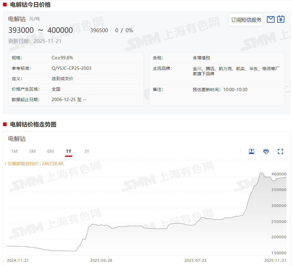 而截至11月21日,电解钴现货报价暂时持稳于39.3~40万元/吨,均价报39.65万元/吨。据SMM了解,当前电解钴需求端出现边际改善迹象,虽下游主体仍以刚性需求采购为主,但在价格筑稳后,部分企业的询盘与采购意愿有所回升,市场整体成交较前期有所改善;而供应端,受原料成本支撑,生产商及持货商报盘维持坚挺,贸易商亦随盘面反弹而上调报价。当前电钴与钴盐价差已回归至合理区间,后续电钴价格的进一步上涨,仍需钴盐市场提供更强的带动作用。