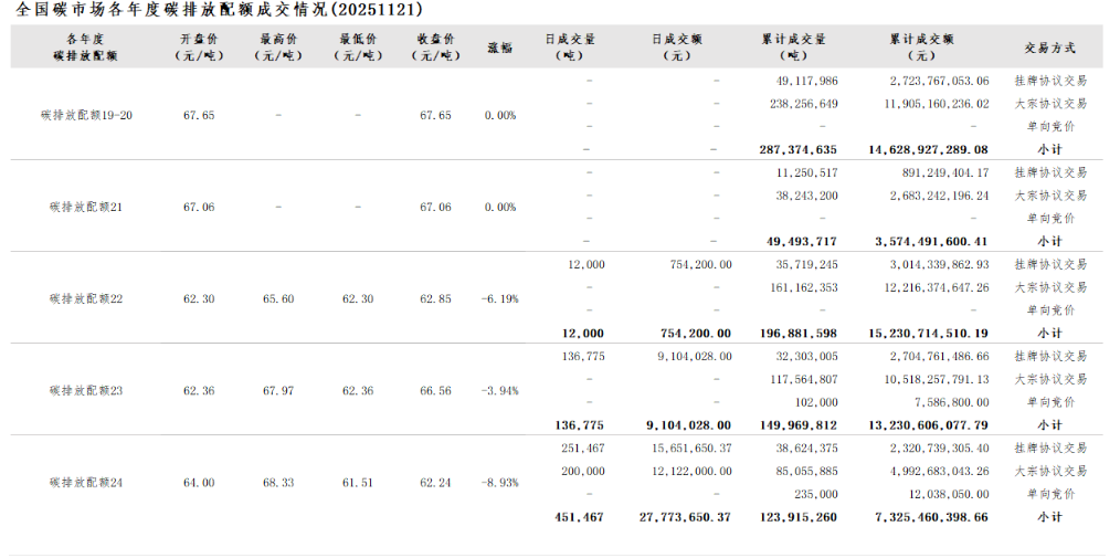 2025年1月1日至11月21日,全国碳市场碳排放配额成交量177,366,358吨,成交额10,957,472,772.62元。