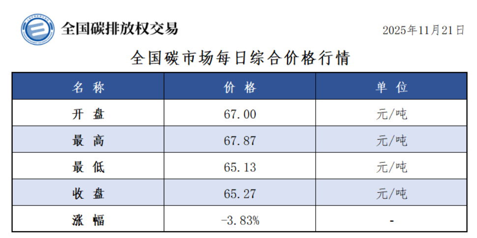 今日全国碳市场综合价格行情为: 开盘价67.00元/吨,最高价67.87元/吨,最低价65.13元/吨,收盘价65.27元/吨,收盘价较前一日下跌3.83%。