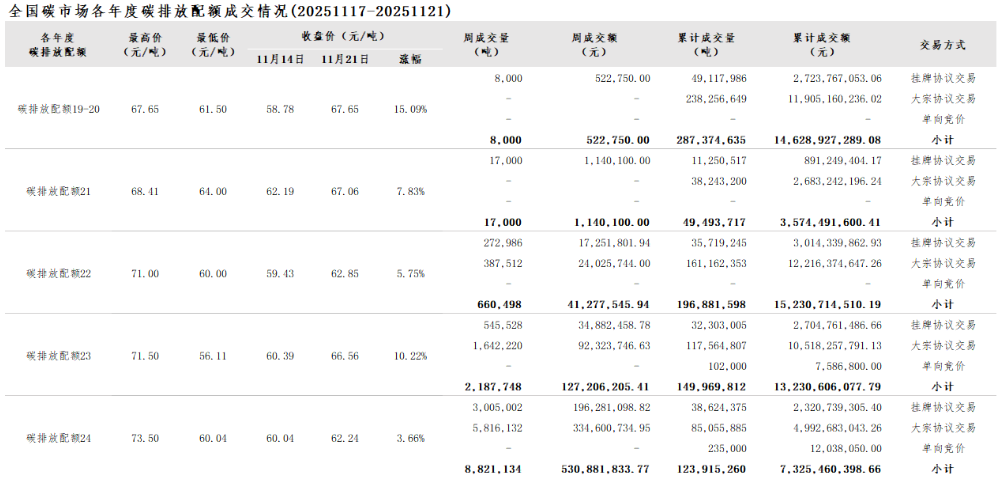 2025年1月1日至11月21日,全国碳市场碳排放配额成交量177,366,358吨,成交额10,957,472,772.62元。