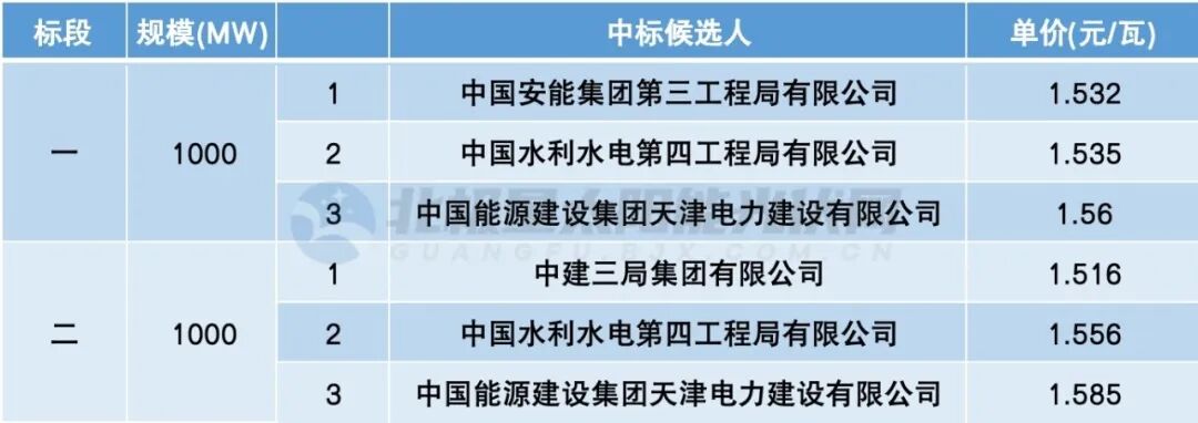 公示显示,中国安能集团第三工程局有限公司、中建三局集团有限公司拟中标该项目,投标报价在1.516元/W~1.585元/W。